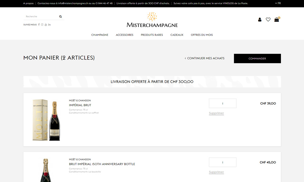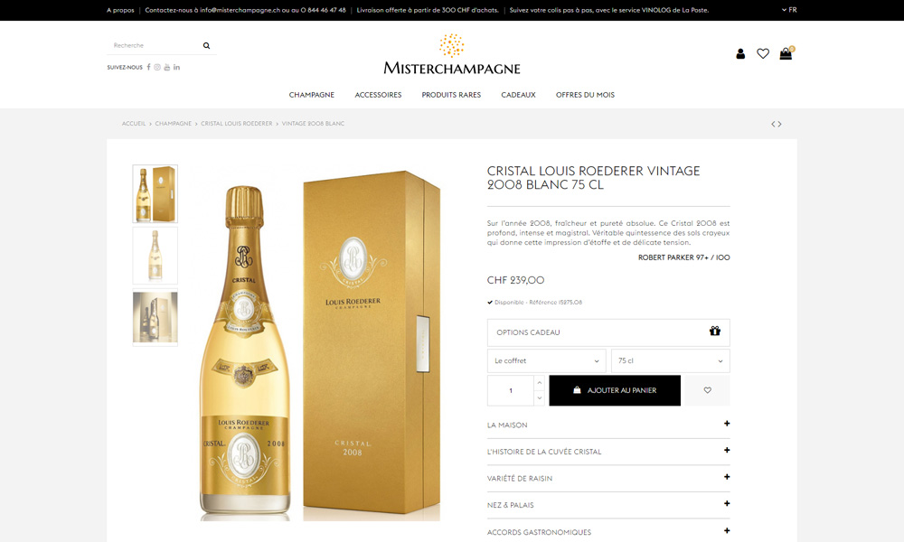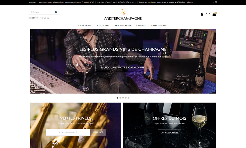 Official Swiss distributor of the LVMH Group’s leading Champagne brands, we wanted to develop the online sales site misterchampagne.ch under Prestashop 1.7, to be both accessible, top-of-the-range and perfectly in line with the needs of the audience and consumer profiles.